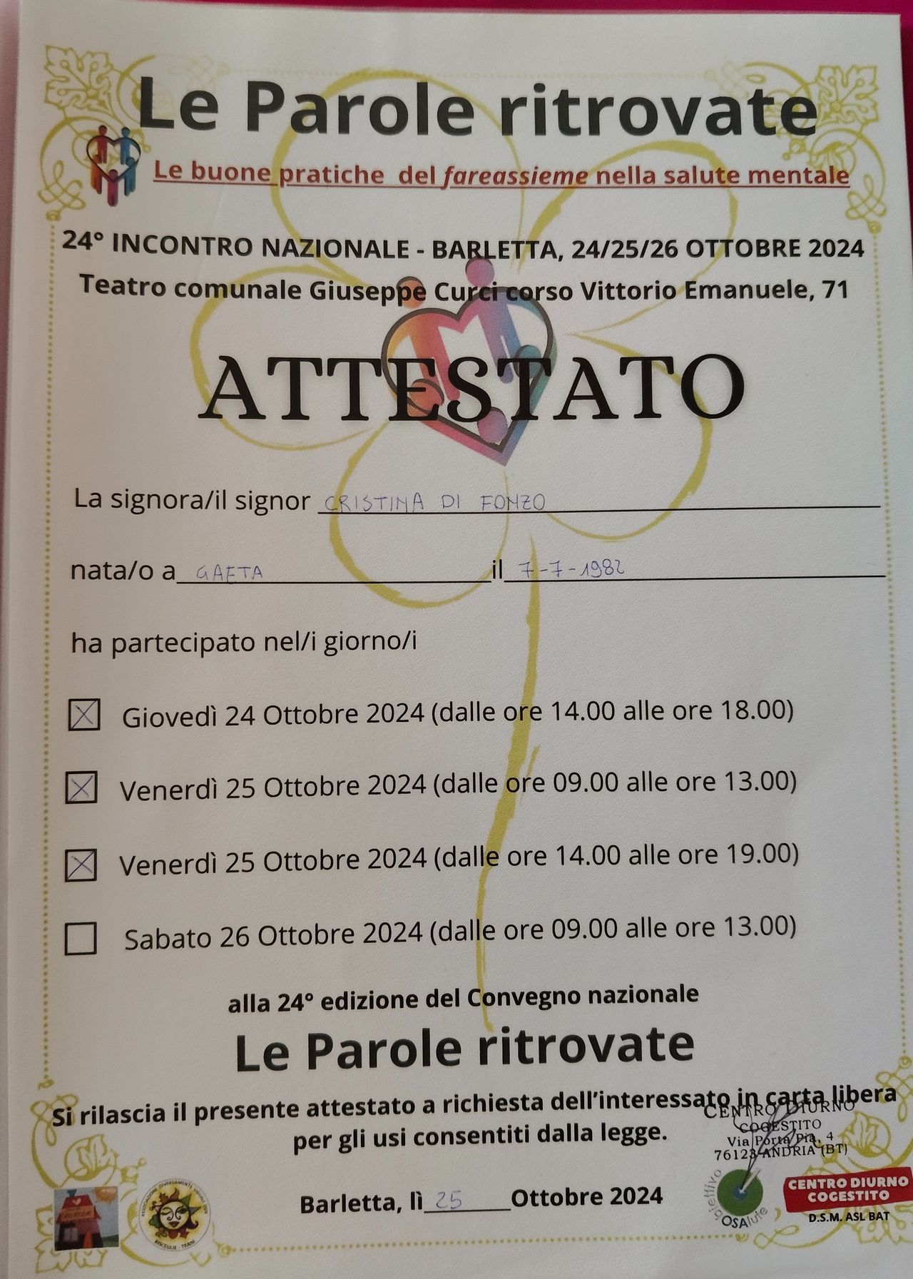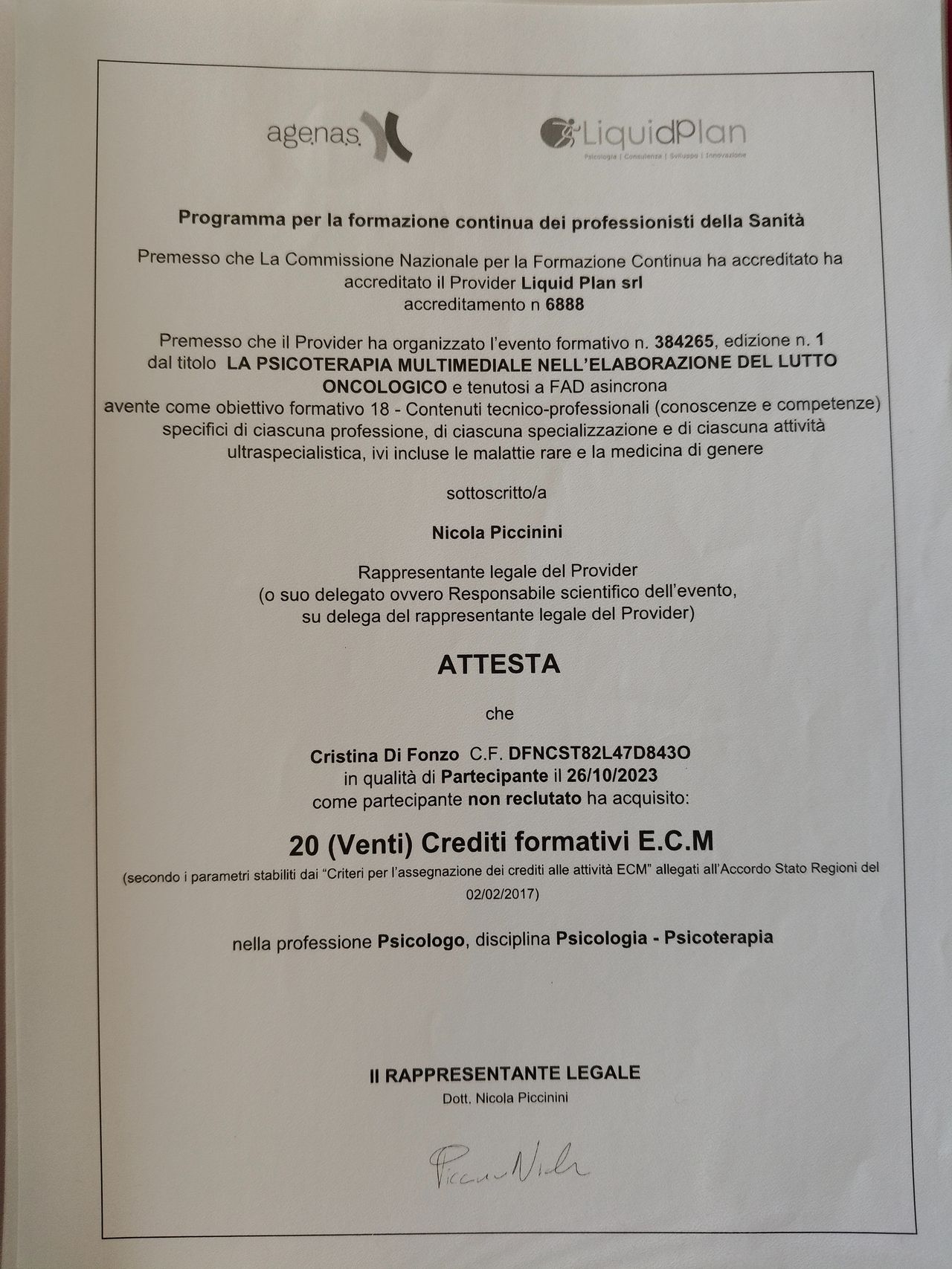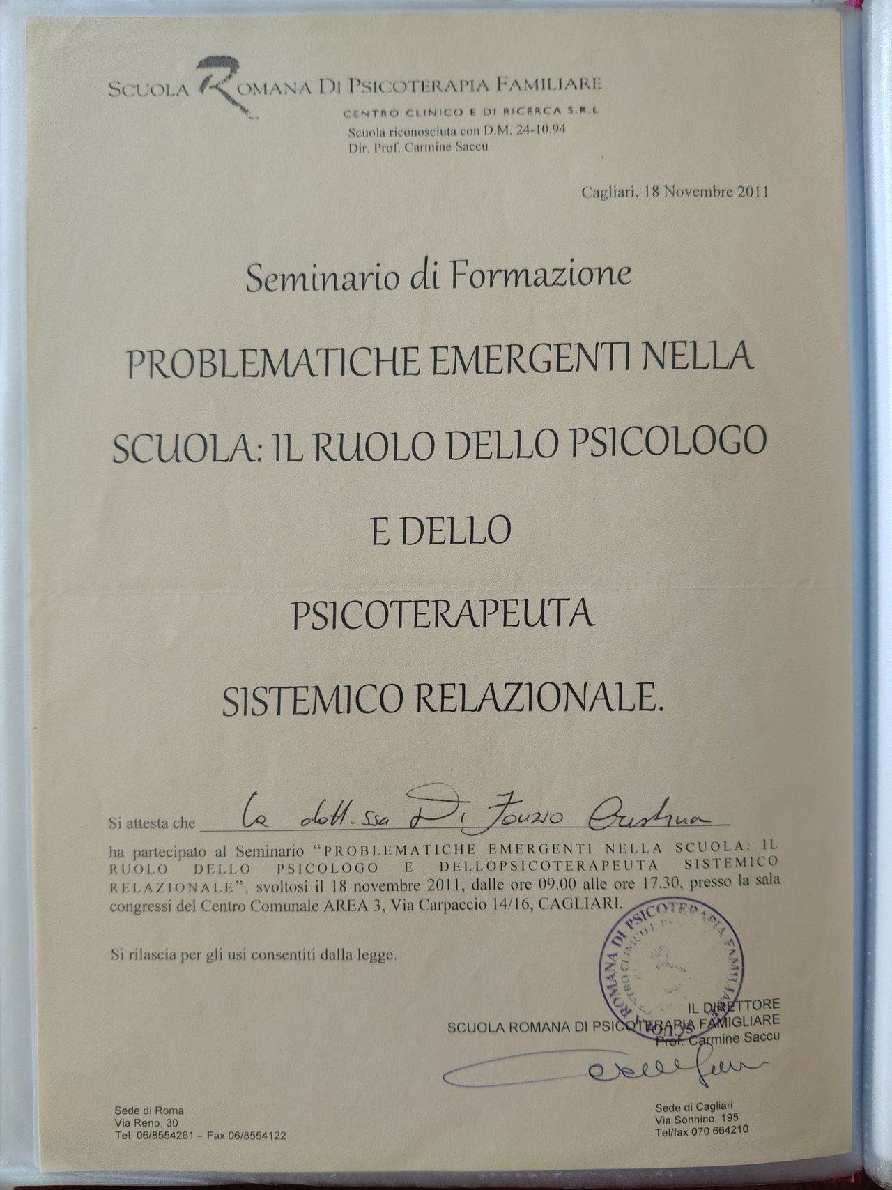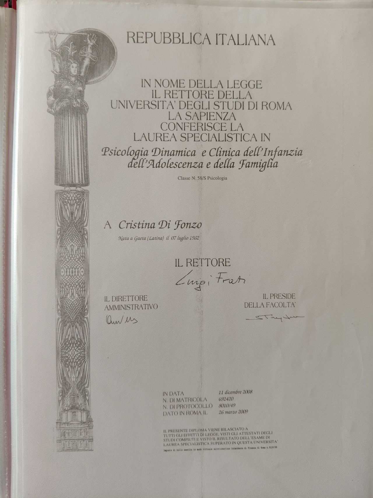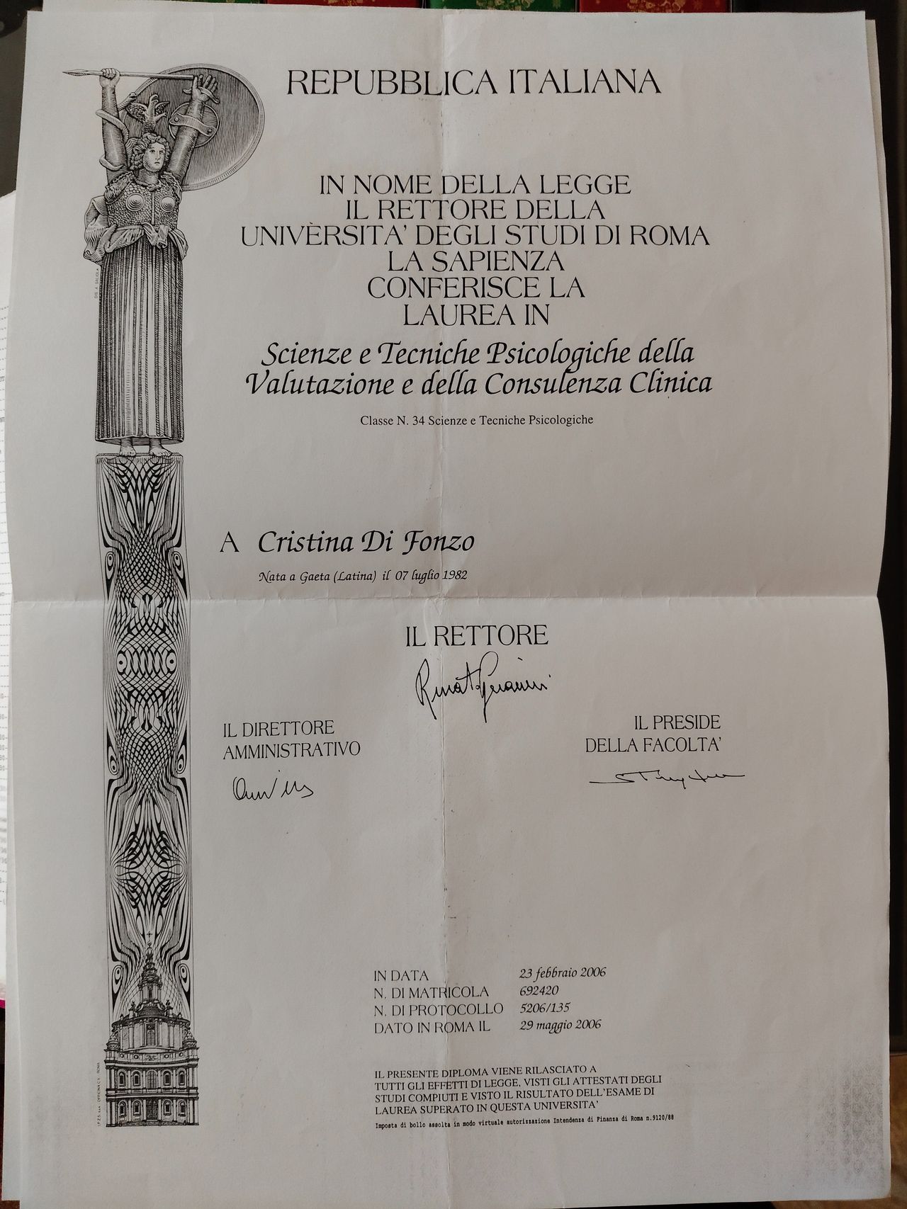 Ho conseguito la laurea in psicologia clinica nel 2008 con 110/110. Nel 2014 mi sono specializzata in psicoterapia presso la Scuola Romana di Psicoterapia Familiare a Cagliari. Ho lavorato per 10 anni come psicologa scolastica per numerosi progetti negli Istituti Scolastici Statali Inferiori nella provincia di Sassari e poi, dal 2018, a Roma. Ho acquisito esperienza e formazione nell'ambito della Pet therapy con utenti affetti da varie patologie. Sono esperta in psico-oncologia e lavoro da sempre anche nel campo della disabilità psico-motoria (adulti). Le esperienze lavorative svolte in campi diversi sono state preziose per la mia crescita professionale e personale. In particolar modo quella presso il Centro di Salute Mentale e il TSMREE di Anzio è stata particolarmente arricchente in quanto mi ha offerto l'opportunità di svolgere un efficace lavoro di equipe con diverse figure (psichiatri, neuropsichiatri infantili, educatori professionali, infermieri psichiatrici e assistenti sociali), per la gestione di problematiche psichiatriche complesse.
